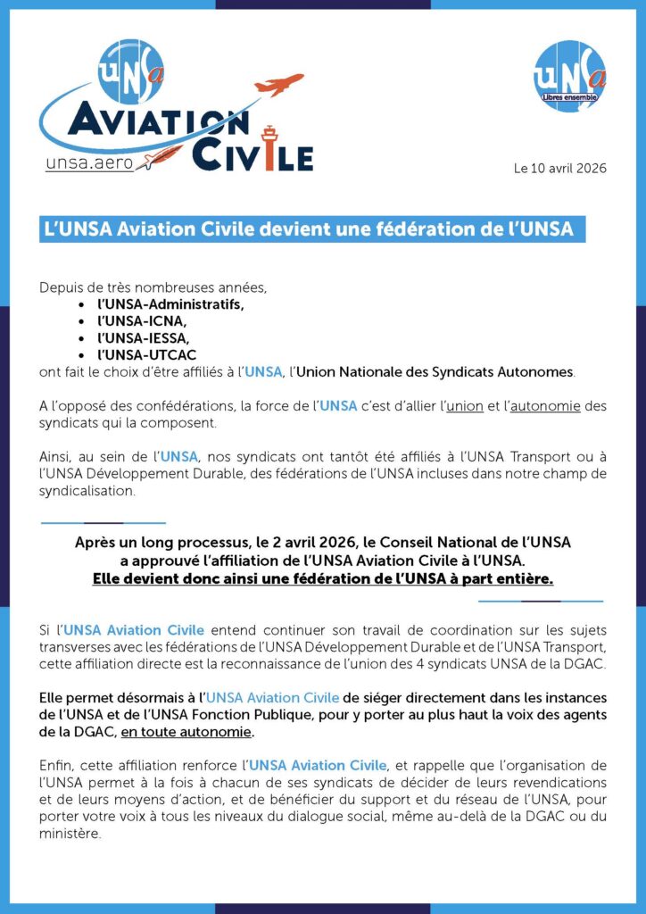 Après un long processus, le 2 avril 2026, le Conseil National de l’UNSA a approuvé l’affiliation de l’UNSA Aviation Civile à l’UNSA. Elle devient donc ainsi une fédération de l’UNSA à part entière.