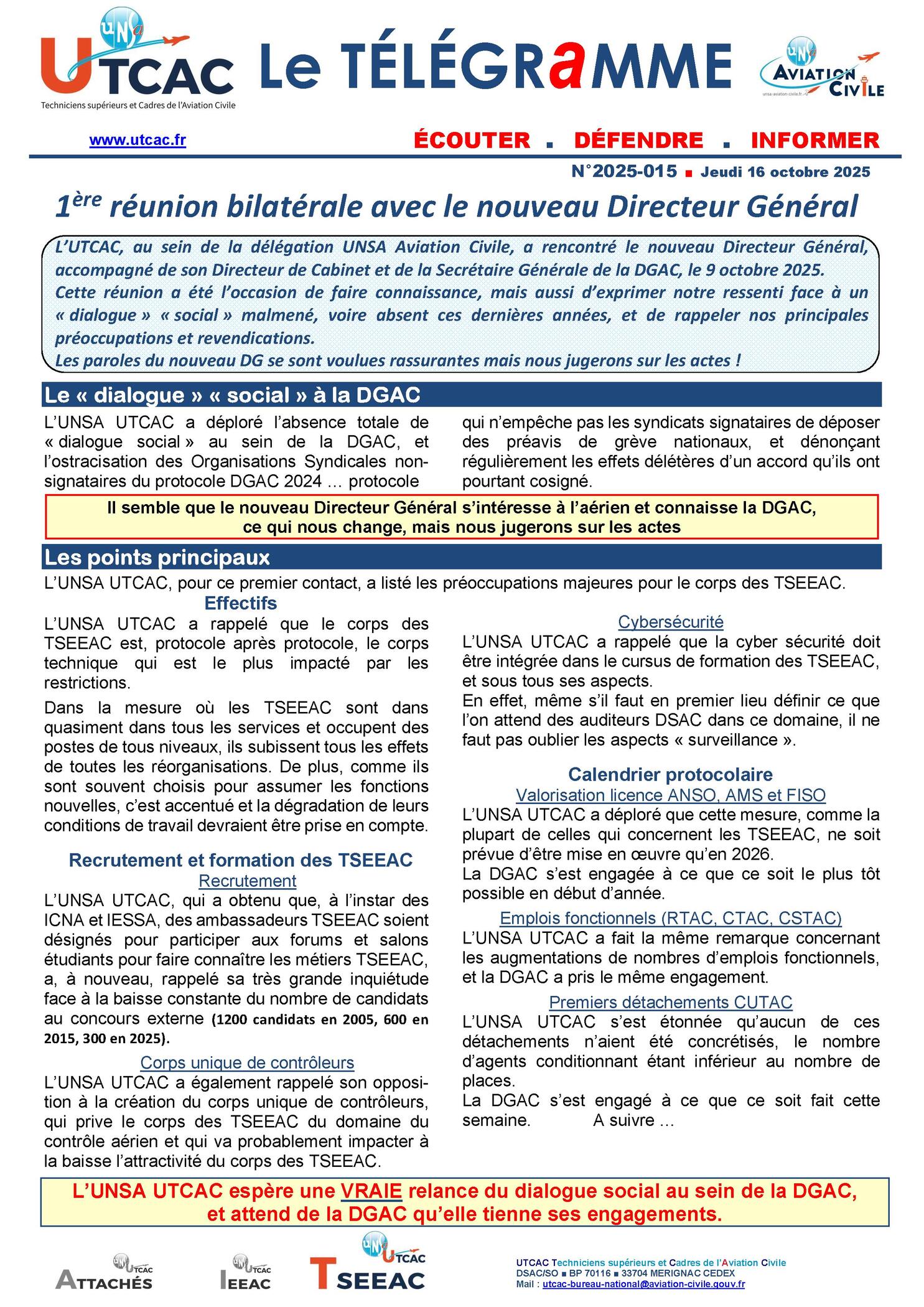 L’UTCAC, au sein de la délégation UNSA Aviation Civile, a rencontré le nouveau Directeur Général, accompagné de son Directeur de Cabinet et de la Secrétaire Générale de la DGAC, le 9 octobre 2025.Cette réunion a été l’occasion de faire connaissance, mais aussi d’exprimer notre ressenti face à un« dialogue » « social » malmené, voire …