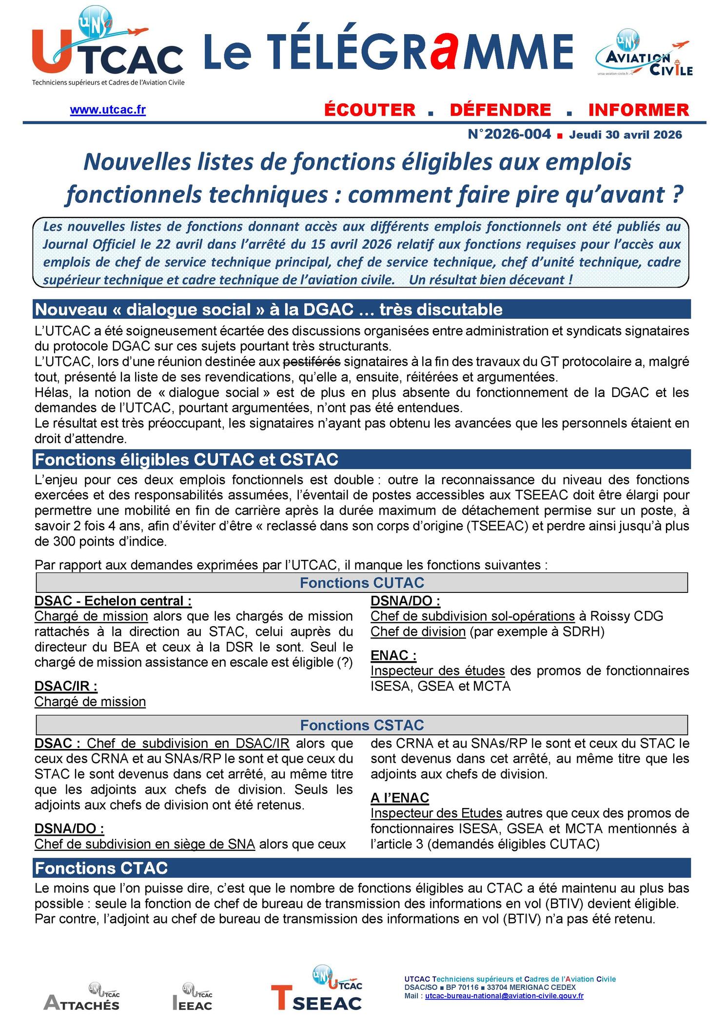 Les nouvelles listes de fonctions donnant accès aux différents emplois fonctionnels ont été publiés au Journal Officiel le 22 avril dans l’arrêté du 15 avril 2026 relatif aux fonctions requises pour l’accès aux emplois de chef de service technique principal, chef de service technique, chef d’unité technique, cadre supérieur technique et cadre technique de l’aviation …